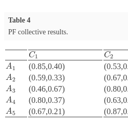 According to the information given above, one can summarize the rows of the PF collective decision matrix and thus obtain the comprehensive value of the alternatives. The aggregation results rendered by the PFWIGOWA (