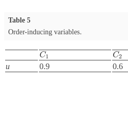 $W={(0.15,0.1,0.25,0.3,0.2)^{T}}$. The order-inducing variables are listed in Table