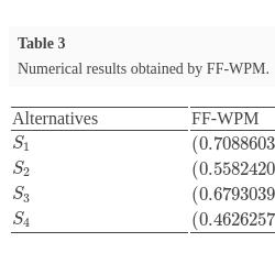 3 are obtained by calculating the score and accuracy functions of FF-WPM. It can be seen that the most preferred alternative is