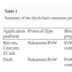 2019) to which we refer interested readers for a detailed information. The main features of interest include application platform, protocol and type, block proposal (block producing mechanism), block validation (blocks and transactions validity check), block finalization, fault tolerance, throughput (maximal number of transactions per second) and network scalability (ability to process an increasing number of transactions by adding resources to the network) in the same context, as in the study list.