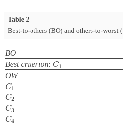 {C_{2}}$ must have the same weight. After solving the BWM model, weights of the criteria are obtained as shown in the second column in Table