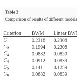 4 also presents the distance from the centre of intervals which is 0.0612 for the BWM, 0.0668 for the linear BWM, 0.0559 for the proposed nonlinear model, and 0.0680 for the proposed linear model. According to the results, the solutions found by all the models are very close to the centre of intervals.