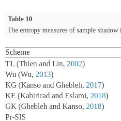 10 presents the entropy measures of sample shadow images of the schemes under comparison.