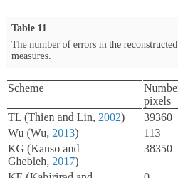 11 presents the mean absolute difference of the secret image Pirate and the reconstructed image by the schemes under comparison. This table also presents the Peak Signal to Noise Ratio (PSNR) and The Structural Similarity (SSIM) measures between the secret image and the reconstructed one (Wang