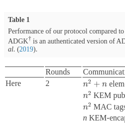 • Our protocol. In the first round, $n+1$ elements of G and n public keys of the KEM are broadcast, yielding a total of ${n^{2}}+n$ elements of G and ${n^{2}}$ public keys to be transmitted. In the second round, ${n^{2}}$ tags, n KEM ciphertexts, and n masked ephemeral keys are sent.