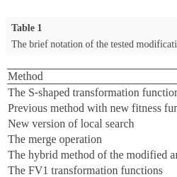 However, there are two disadvantages that make it difficult to apply this method to some algorithms. The first is that the method is practically inapplicable if the algorithm uses any operations other than addition, subtraction, multiplication, and division. The second disadvantage is typical for all methods that require working with binary vectors. Many metaheuristic algorithms, in addition to operations directly on vectors, also use a variety of coefficients represented by real numbers. When switching to binary vectors, these coefficients must also be changed or abandoned, which leads to a change in the original idea of the algorithm and, accordingly, may affect the quality of its work. So, when modifying the PSO algorithm, the authors of Yuan