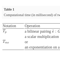| ${T_{p}}$ | a bilinear pairing $\hat{e}:{G_{1}}\times {G_{1}}\to {G_{2}}$ | 7.84 ms |