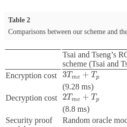 | Encryption cost | $3{T_{me}}+{T_{p}}$ | $6{T_{me}}$ | $4{T_{me}}+{T_{p}}$ | $4{T_{me}}+2{T_{p}}$ |