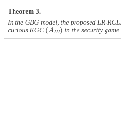 – Setup phase: The phase is the same as that in the proof in Theorem 1. Additionally, B sends the KGC’s secret key $\textit{KSK}$ and time secret key $\textit{TSK}$ to ${A_{\textit{III}}}$ since it is an honest-but-curious KGC.