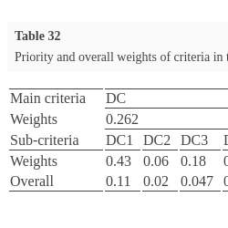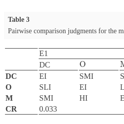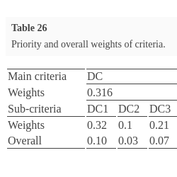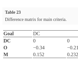 | Sub-criteria | DC1 | DC2 | DC3 | DC4 | DC5 | O1 | O2 | O3 | O4 | M1 | M2 | M3 | M4 | M5 | M6 |