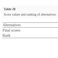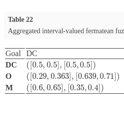 \[\begin{aligned}{}& \textit{IVPFWG}({z_{1}},{z_{2}},\dots ,{z_{k}})\\ {} & \hspace{1em}=\Bigg(\Bigg[{\prod \limits_{k=1}^{K}}{\big({\mu _{k}^{L}}\big)^{{w_{k}}}},{\prod \limits_{k=1}^{K}}{\big({\mu _{k}^{U}}\big)^{{w_{k}}}}\Bigg],\\ {} & \hspace{2em}\times \Bigg[\sqrt[3]{\Bigg(1-{\prod \limits_{k=1}^{K}}{\big(1-{\big({\upsilon _{k}^{L}}\big)^{3}}\big)^{{w_{k}}}}\Bigg)},\sqrt[3]{\Bigg(1-{\prod \limits_{k=1}^{K}}{\big(1-{\big({\upsilon _{k}^{U}}\big)^{3}}\big)^{{w_{k}}}}\Bigg)}\Bigg]\Bigg).\end{aligned}\]5 Application