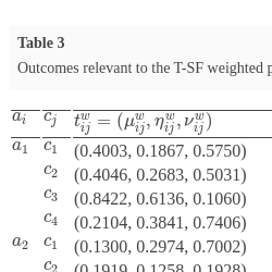 ${t_{13}^{w}}=(n\cdot {w_{3}})\odot {t_{13}}=(4\times 0.3)\odot {t_{13}}=({[1-{(1-{0.81^{3}})^{1.2}}]^{1/3}},{[{(1-{0.81^{3}})^{1.2}}-{(1-{0.81^{3}}-{0.62^{3}})^{1.2}}]^{1/3}},{[{(1-{0.81^{3}}-{0.62^{3}})^{1.2}}-{(1-{0.81^{3}}-{0.62^{3}}-{0.11^{3}})^{1.2}}]^{1/3}})=(0.8422,0.6136,0.1060)$, where the refusal-membership