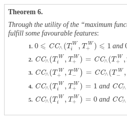 $\overline{\textit{CC}}{\hspace{0.1667em}_{\wedge }^{\mathrm{\# }}}={\max _{{i^{\prime }}=1}^{4}}{\textit{CC}_{\wedge }}({T_{{i^{\prime }}}^{W}},{T_{\mathrm{\# }}^{W}})$ for the “maximum function” type. On the grounds of the ideal schemes