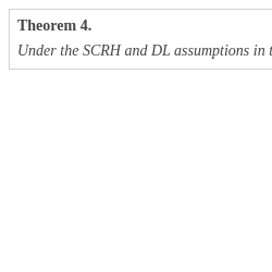 – Strong-collision-resistant hash (SCRH) assumption: Let a hash function $H:{\{0,1\}^{\ast }}\to {\{0,1\}^{l}}$, l is a large integer, be strong-collision-resistant. Namely, it is difficult to get two different strings ${S_{1}},{S_{2}}\in {\{0,1\}^{\ast }}$ such that $H({S_{1}})=H({S_{2}})$.