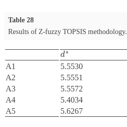 | Alternatives | Ranking of Z-fuzzy EDAS | Ranking of Z-fuzzy TOPSIS |
