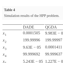 \[\begin{aligned}{}& f(\bar{x})=9{x_{1}}+15{x_{2}}-6{x_{3}}-16{x_{4}}-10({x_{5}}+{x_{6}}),\\ {} & {h_{1}}(\bar{x})={x_{7}}+{x_{8}}-{x_{4}}-{x_{3}}=0,\\ {} & {h_{2}}(\bar{x})={x_{1}}-{x_{5}}-{x_{7}}=0,\\ {} & {h_{3}}(\bar{x})={x_{2}}-{x_{6}}-{x_{8}}=0,\\ {} & {h_{4}}(\bar{x})={x_{7}}{x_{9}}+{x_{8}}{x_{9}}-3{x_{3}}-{x_{4}}=0,\\ {} & {g_{1}}(\bar{x})={x_{7}}{x_{9}}+2{x_{5}}-2.5{x_{1}}\leqslant 0,\\ {} & {g_{2}}(\bar{x})={x_{8}}{x_{9}}+2{x_{6}}-1.5{x_{2}}\leqslant 0,\\ {} & 0\leqslant {x_{1}},{x_{3}},{x_{4}},{x_{5}},{x_{6}},{x_{8}}\leqslant 100,\hspace{1em}0\leqslant {x_{2}},{x_{7}},{x_{9}}\leqslant 200.\end{aligned}\]Table 4