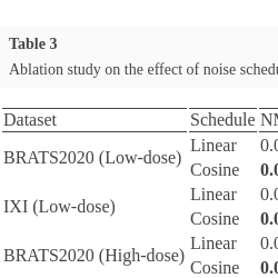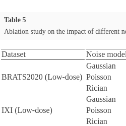 To evaluate the robustness of SynthModDiff under different noise characteristics, we conducted an ablation study comparing Gaussian, Poisson, and Rician noise models. As shown in Table