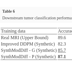 To evaluate the practical impact of SynthModDiff, we further conducted a downstream tumour classification task using synthetic multi-contrast MRI images. As shown in Table