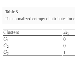 We use $X=\{{x_{1}},{x_{2}},\dots ,{x_{n}}\}$ to represent the dataset with n samples, where each ${x_{i}}$ has m categorical attributes. The m attributes ${[{A_{1}},{A_{2}},\dots ,{A_{m}}]^{T}}$ are also represented by the attribute vector A. Each attribute ${A_{i}}$ has a value domain defined by $[{a_{i,1}},{a_{i,2}},\dots ,{a_{i,{n_{i}}}}]$ $(1\leqslant i\leqslant m)$, where ${n_{i}}$ is the number of distinct values in attribute ${A_{i}}$. From the information-theoretic perspective, ${A_{i}}$ is considered a random variable, and $A={[{A_{1}},{A_{2}},{A_{3}},\dots ,{A_{m}}]^{T}}$ is considered a random vector. The entropy $E(A)$ of the random vector A on the set X is defined, according to the chain rule for the entropy (Cover and Thomas, 2012), by: