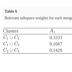 From this example, we can see that the holo-entropy of two merged subclusters from the same (homogeneous) class is much smaller than that of merged subclusters from different (heterogeneous) classes. This indicates that holo-entropy is an effective measurement for the compactness of a subspace in a cluster. In what follows, we will use the holo-entropy for subspace detection. Moreover, we will employ the soft clustering method (Domeniconi et al., 2004; Gan and Wu, 2004; Nemalhabib and Shiri, 2006) and the properties of holo-entropy for merging subclusters in the hierarchical clustering.