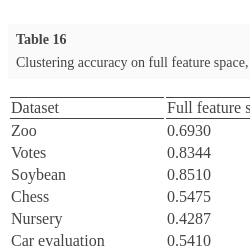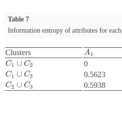 Finally, the MGR algorithm (Qin et al., 2014) searches equivalence classes from attribute partitions to form the clustering of objects which can share the greatest possible quantity of information with the attribute partitions. First, MGR selects the clustering attribute whose partition shares the most information with the partitions defined by other attributes. Then, on the clustering attribute, the equivalence class with the highest intra-class similarity is output as a cluster, and the rest of the objects form the new current dataset. The above two steps are repeated on the new current dataset until all objects are output. In MGR, because the attributes are selected one by one, the relevancy of attributes (or combinations of attributes) is not considered sufficiently. For example, say attribute A1 has the most information, and A2 is in second place. It is not necessarily true that the combination A1, A2 has more information than some other combination A3, A4. How to select the subcluster of attributes which shares the most information with the partitions will be analysed in this paper.