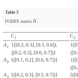 | ${A_{2}}$ | $\{([0.6,0.8],[0.1,0.2])\}$ | $\begin{array}[t]{l}\{([0.2,0.3],[0.4,0.5]),\\ {} ([0.4,0.5],[0.3,0.4])\}\end{array}$ | $\{([0.5,0.7],[0.1,0.3])\}$ | $\begin{array}[t]{l}\{([0.4,0.5],[0.2,0.4]),\\ {} ([0.6,0.7],[0.1,0.2])\}\end{array}$ |