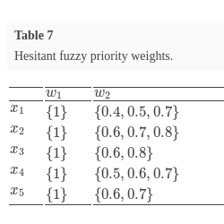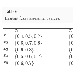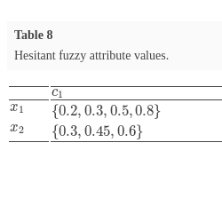 where ${h_{E}}(x)$ is a set of several values in $[0,1]$, representing the possible membership degrees of the element $x\in X$ to the set E. For convenience, Xia and Xu (2011) called $h={h_{E}}(x)$ a hesitant fuzzy element (HFE).