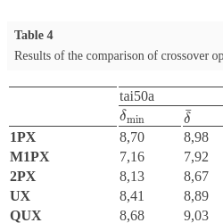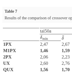 The cohesive crossover was proposed by Z. Drezner to efficiently recombine individuals’ genes by solving the quadratic assignment problem. In this case, the appropriateness of the genes – which is calculated according to the problem data – is taken into consideration. From the several recombinations of genes, the recombination is selected that minimizes the objective function. The details of implementation of the cohesive crossover are described in Drezner (2003).
