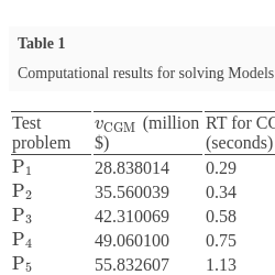 Let ${\eta _{{h_{1}},t,j,h}^{1}}$ and ${\eta _{{h_{1}},t,j,h}^{2}}$ for $\forall {h_{1}},t,j,h>{h_{1}}$ be binary indicator parameters that take on a value of 1 if and only if the delivery date h of vessels of type t traverses journey ${J_{j}}$ starting on day h; exceeds the corresponding start time plus the journey duration, and serves to set the associated duration-incompatible u-variables that are defined subsequently to zero. Define ${x_{h,t,j}}$ to be an integer variable that represents the number of vessels of type t that traverse journey ${J_{j}}$ starting on day h; and let ${u_{{h_{1}},t,j,h}^{1}}={x_{{h_{1}},t,j}}{\eta _{{h_{1}},t,j,h}^{1}}$ and ${u_{{h_{1}},t,j,h}^{2}}={x_{{h_{1}},t,j}}{\eta _{{h_{1}},t,j,h}^{2}}$, $\forall {h_{1}},t,j,h>{h_{1}}$. Hence, ${u_{{h_{1}},t,j,h}^{1}}$ is an integer variable that represents the number of vessels of type t-th at start journey ${J_{j}^{}}$ on day ${h_{1}}$ and that arrive at point ${p_{2}^{j}}$ on or before day h. Similarly, ${u_{{h_{1}},t,j,h}^{2}}$ is an integer variable that represents the number of vessels of type t that start journey ${J_{j}}$ on day ${h_{1}}$ and that terminate this journey at point ${p_{3}^{j}}$ on or before day h.