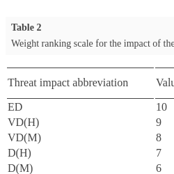 The experts were requested to rate the main threats according to linguistic significance scale. Finally, linguistic variables are converted to fuzzy numbers and ranks determined (Tables