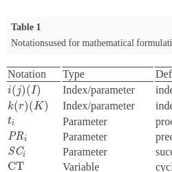 The proposed entropy-based assembly line balancing problem of this paper uses the above-mentioned concepts to optimize an entropy objective function and two more objective functions simultaneously. In order to further formulate this problem, we need to define some notations in Table 1.