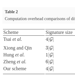 | Tsai et al. | $4|\mathcal{G}|$ | $1SM+(\frac{{n_{m}}}{2}+1)M$ | $7P+(\frac{{n_{u}}+{n_{t}}+{n_{k}}+{n_{s}}+{n_{m}}}{5}+5)M$ |