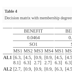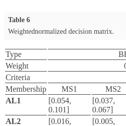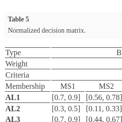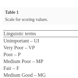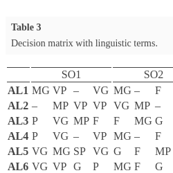 3. In this table, the committee can assign different linguistic evaluations for each criterion. The number of these evaluations may change from one to four since the hesitant fuzzy approach requires it. The hyphens in the table indicate that a member of the committee did not prefer making an evaluation for the related alternative with respect to the considered criterion.