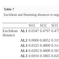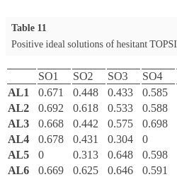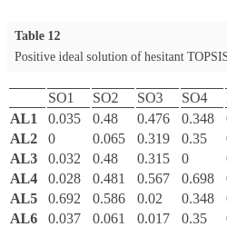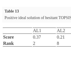The negative ideal solutions of the hesitant TOPSIS method are given in Table