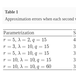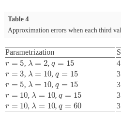 In this experiment we consider two situations: one is when each second value is missing, and the other is when each third value is received. Also, several parametrizations are considered. After running the tests, we get the approximation errors listed as follows (Tables