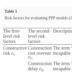 | Constructive risk ${c_{1}}$ | Construction cost overrun ${c_{{1_{1}}}}$ | The term ‘construction cost overrun’ refers to the possibility that the infrastructure is incapable of delivering within the budget. |