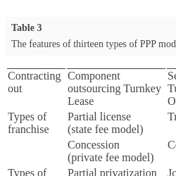 | Contracting out | Component outsourcing Turnkey Lease | Service Contract Management Contract Design-Build Turnkey Operation Lease-Development-Operation Build-Transfer-Operation | High public ownership ↓ |