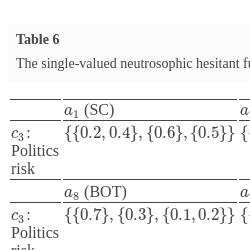 | ${c_{3}}$: Politics risk | $\{\{0.7\},\{0.3\},\{0.1,0.2\}\}$ | $\{\{0.6,0.8\},\{0.2\},\{0.1\}\}$ | $\{\{0.3\},\{0.5,0.6\},\{0.4\}\}$ | $\{\{0.2\},\{0.5,0.6\},\{0.4\}\}$ | $\{\{0.1\},\{0.4\},\{0.5,0.6\}\}$ | $\{\{0.8\},\{0.1,0.2\},\{0.2\}\}$ |