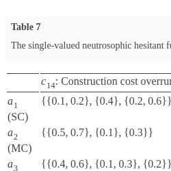 | ${c_{3}}$: Politics risk | $\{\{0.2,0.4\},\{0.6\},\{0.5\}\}$ | $\{\{0.6,0.7\},\{0.3\},\{0.1,0.2\}\}$ | $\{\{0.6\},\{0.3,0.4\},\{0.2\}\}$ | $\{\{0.1,0.2\},\{0.7\},\{0.3\}\}$ | $\{\{0.5,0.7\},\{0.3\},\{0.1,0.2\}\}$ | $\{\{0.2,0.3\},\{0.5\},\{0.7\}\}$ | $\{\{0.3\},\{0.5,0.6\},\{0.4\}\}$ |