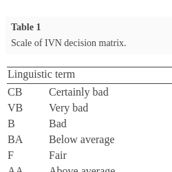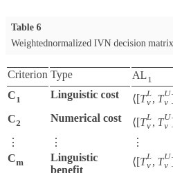Closeness coefficient ($c{c_{i}}$) of each criterion is calculated as follows: AL1 = 0.4961, AL2 = 0.5010, AL3 = 0.4972, AL4 = 0.5006, AL5 = 0.5016, and AL6 = −6.2766. After the ranking of alternatives according to $c{c_{i}}$ in ascending order AL6-Wind Power Plant is still the best alternative as in our proposed IVN ELECTRE I method. This comparison shows the reliability of our proposed method.