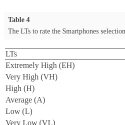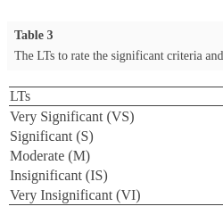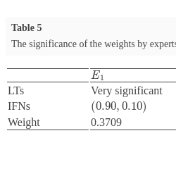 4 describe the linguistic terms (LTs) in the forms of IFNs for the criteria and DEs importance. According to these two tables and Eq. (