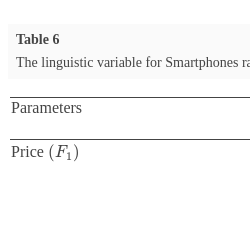 $({M_{7}})$, by a user who needs to purchase a smartphone and three DEs who have thorough knowledge on Smartphones (to construct DEs committee), consequently, a study of the relevant websites and the technology markets is conducted. To select a desirable Smartphone, the following 8 criteria are characterized into three main groups according to the DEs opinions, namely, technical specifications (e.g. storage capacity & RAM, camera, battery power, processor type, operating system), physical specifications (viz., screen size), and user-oriented features (viz., ease of use, price). The operational parameters are given as follows: Price