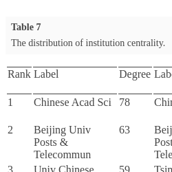 8, the institution collaboration network has two closely connected collaboration groups. One of the collaboration groups has a close connection among internal members, which communicates with others almost only by Chinese Acad Sci. The other collaboration group has a relatively big scale in the network. It is established by some main institutions named CSIRO, Beihang Univ, Beijing Univ Posts & Telecommun, Tsinghua Univ and Univ Oxford. The scale of collaboration among these institutions and other institutions is still enlarging. Chinese Acad Sci is the centre of this network. Chinese Acad Sci and Univ Chinese Acad Sci have the most closely collaborative relationship, which is not only because of the geographical proximity but also due to the affiliated relationship between two institutions. Maybe it is the reason why Univ Chinese Acad Sci has a high value of eigenvector centrality in Table