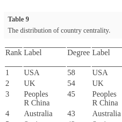 9. The most core countries in this field are UK and the USA which is defined as the country having the highest rank in every centrality indicator. It indicates that UK and the USA have the significant position in the collaboration network.