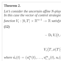 ${V_{i}}(T,x(T))=x{(T)^{\mathrm{t}}}{Q_{i\mathrm{f}}}x(T)$. With this condition and if the assumptions mentioned above are satisfied, the Robust Feedback Nash Equilibrium can be directly obtained as