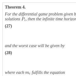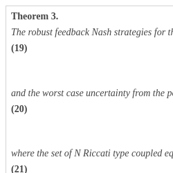 possess symmetric stabilizing solutions ${P_{i}}$, then the infinite time horizon Robust Nash Equilibrium strategies are given by
