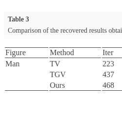 As far as the inpainting of high resolution image is concerned, here we select Man image of size 1024 × 1024 as an instance. The damaged image, which is presented in Fig. 3(b), is deteriorated by an imposed mask, and noisy because of Gaussian noise with standard deviation 15. Regarding this degeneration, the performance of our nonconvex model is demonstrated by comparing with those of the TV and TGV methods. This results in the visual inpainted outcomes, which are shown in the second row of Fig. 3 in turn. Meanwhile, the quantitative evaluations of different approaches are also detailed in Table 3. A point worth emphasizing is that all parameters are valued equivalently just as in the second simulation, except for the coefficient λ is changed to 16 in this situation.