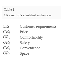 | ${\mathit{CR}_{4}}$ | Convenience | ${\mathit{EC}_{4}}$ | Car internal decoration |