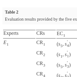 | Experts | CRs | ${\textit{EC}_{1}}$ | ${\textit{EC}_{2}}$ | ${\textit{EC}_{3}}$ | ${\textit{EC}_{4}}$ | ${\textit{EC}_{5}}$ | ${\textit{EC}_{6}}$ |