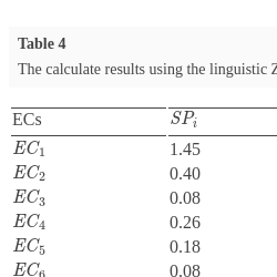 | ECs | ${\textit{SP}_{i}}$ | ${\textit{SN}_{i}}$ | $\overline{{\textit{SP}_{i}}}$ | $\overline{{\textit{SN}_{i}}}$ | ${\textit{IS}_{i}}$ |